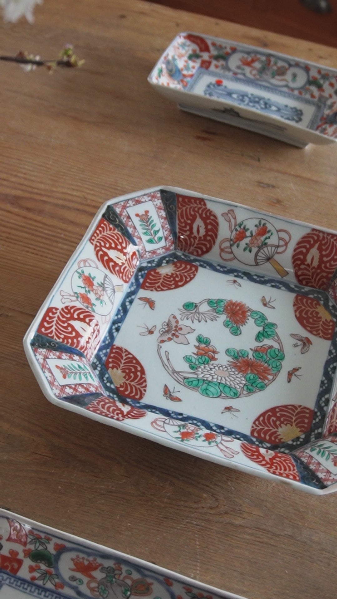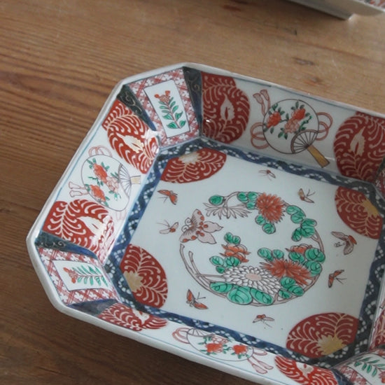 朱や緑、金の彩りが目に眩しい、宝箱のような一枚。中央に描かれた花と蝶が、食卓をパッと明るい春の景色に変えてくれます。 程よいサイズ感の四角皿は、ちらし寿司を盛り付けたり、オードブルの盛り合わせに。骨董ならではの「華」を日常に取り入れたい方におすすめです。