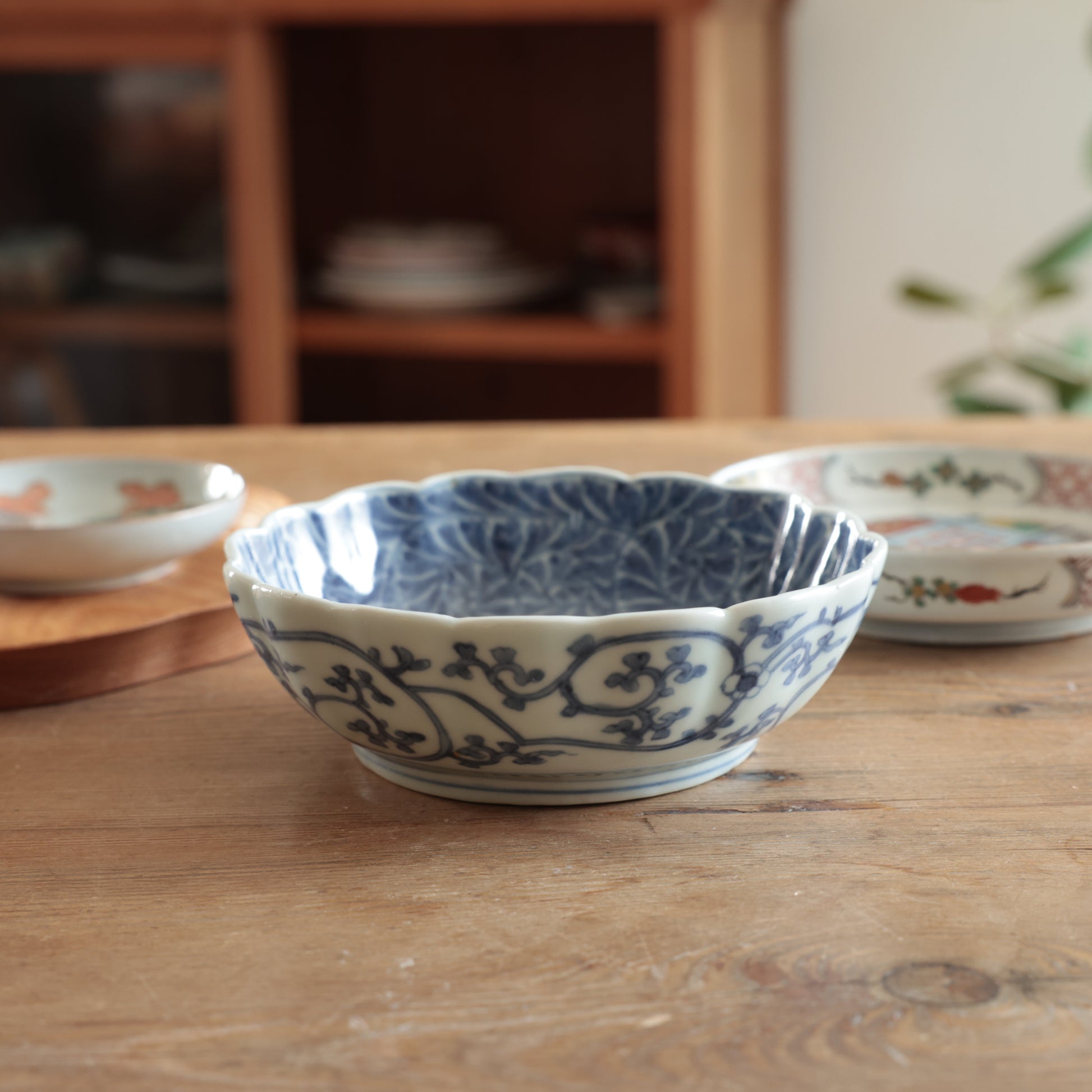 古来より「清らかさ」と「強さ」の象徴とされる松・竹・梅。爽やかな藍にひらひらとした縁のデザインがとても可愛らしい一客です。