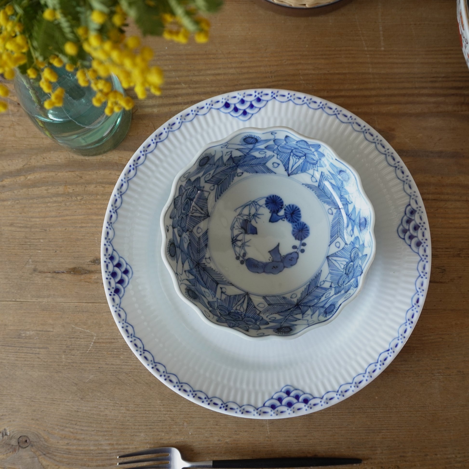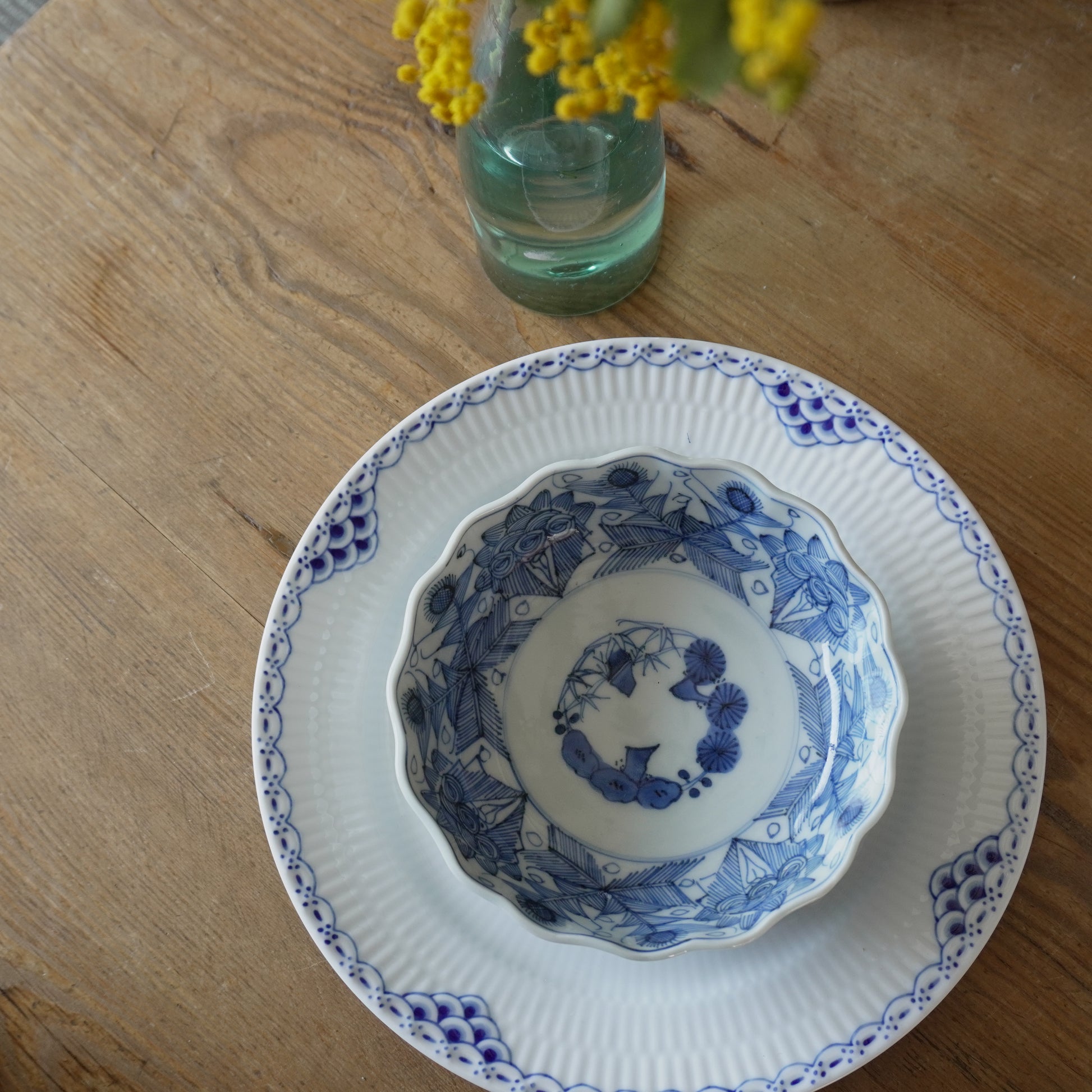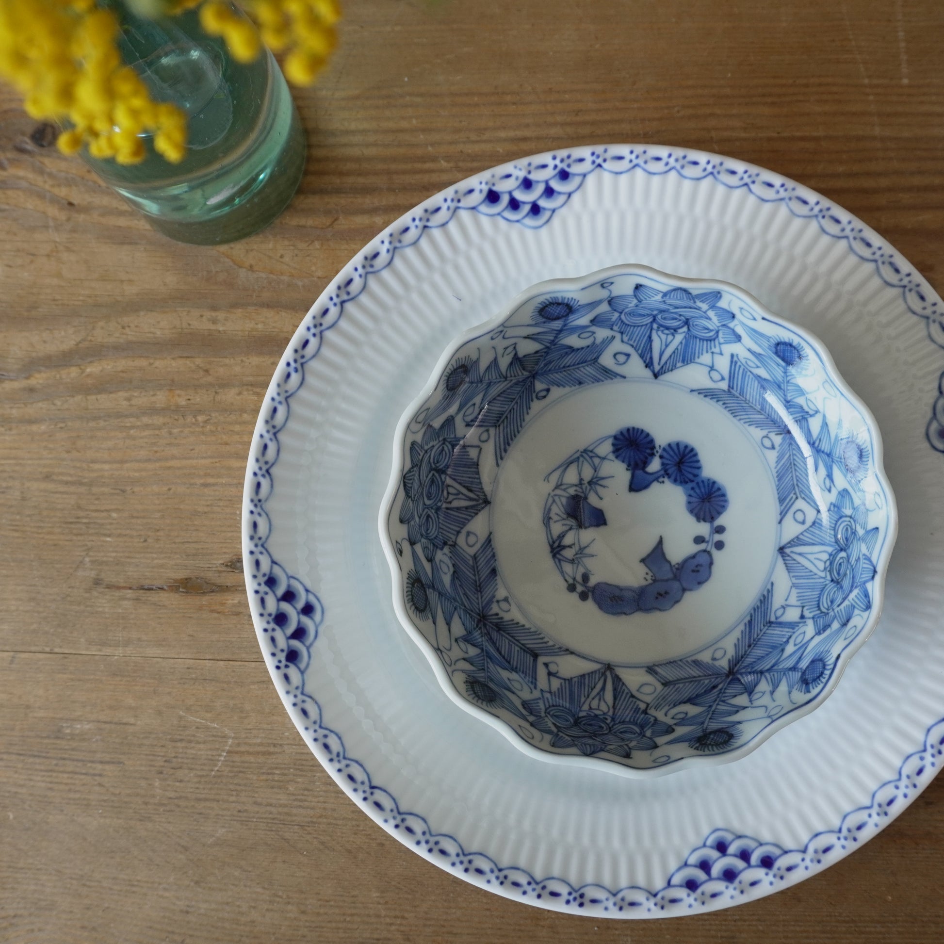 ひらひらと波打つ「輪花(りんか)」の縁取りと淡い藍の色味で描かれた線描きの模様がレースのようで、柔らかさを添えています。古い器ながら、モダンに使える深みのある器です。