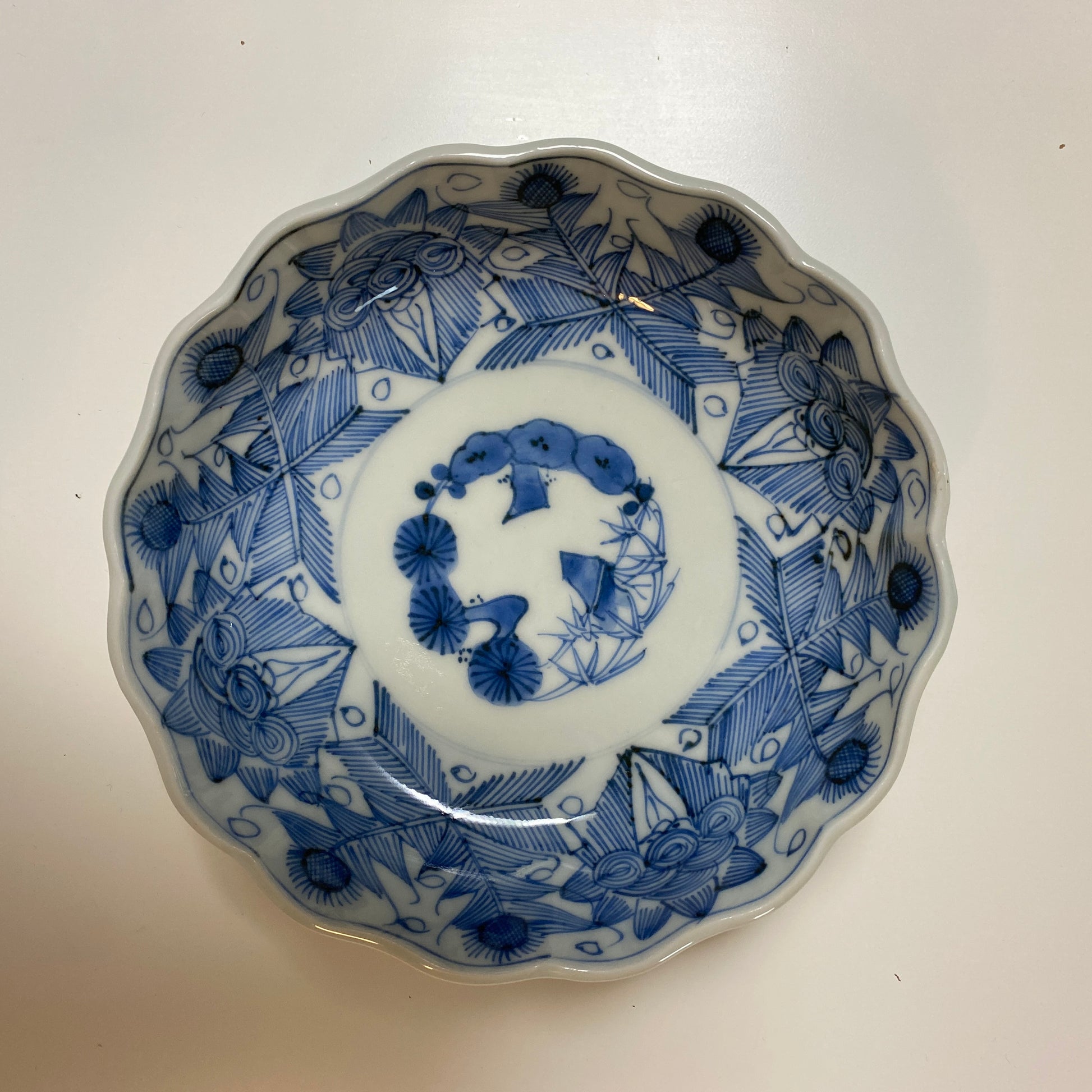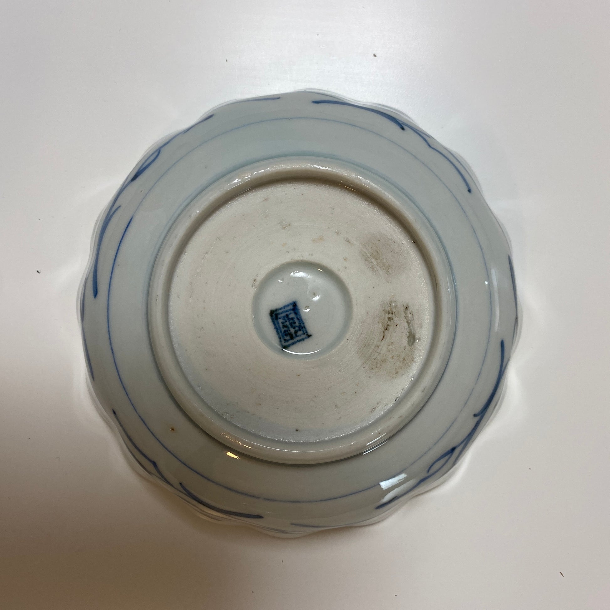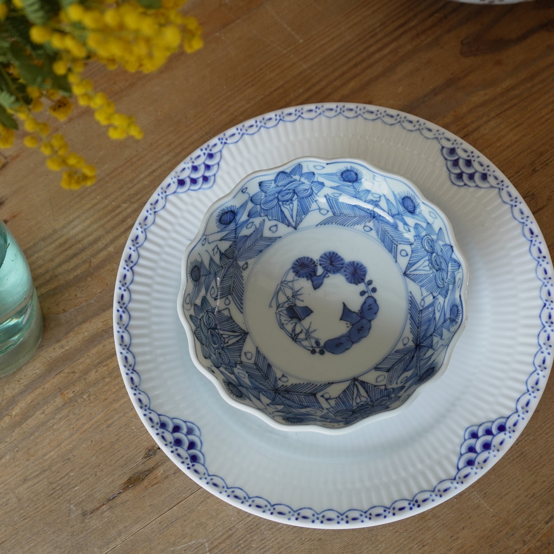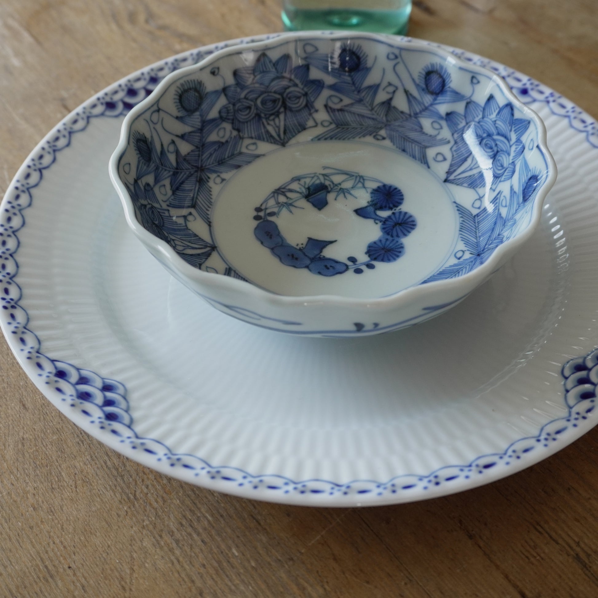 ひらひらと波打つ「輪花(りんか)」の縁取りと淡い藍の色味で描かれた線描きの模様がレースのようで、柔らかさを添えています。古い器ながら、モダンに使える深みのある器です。