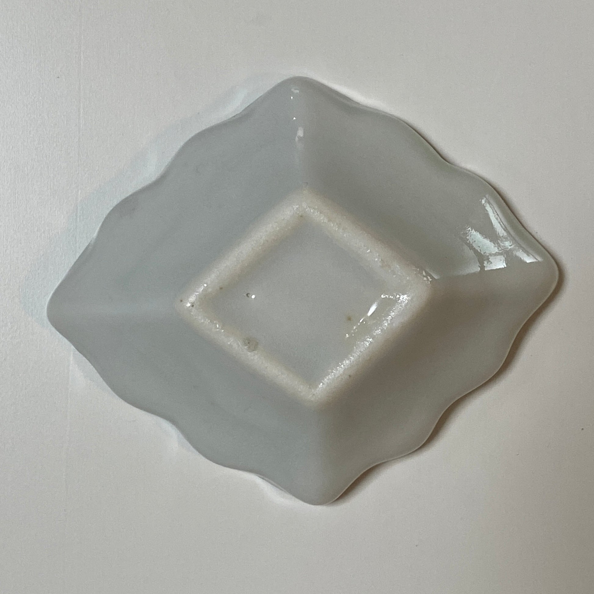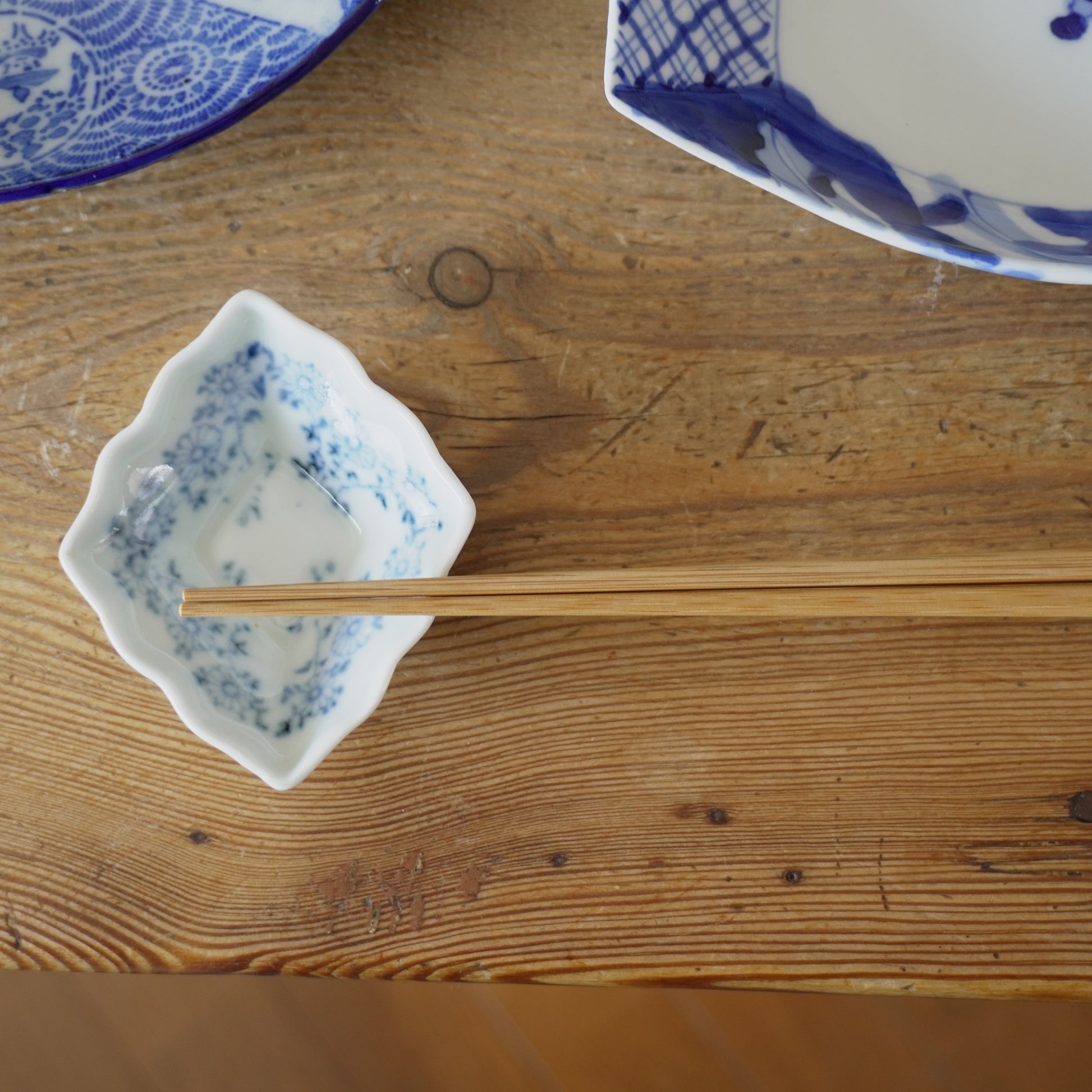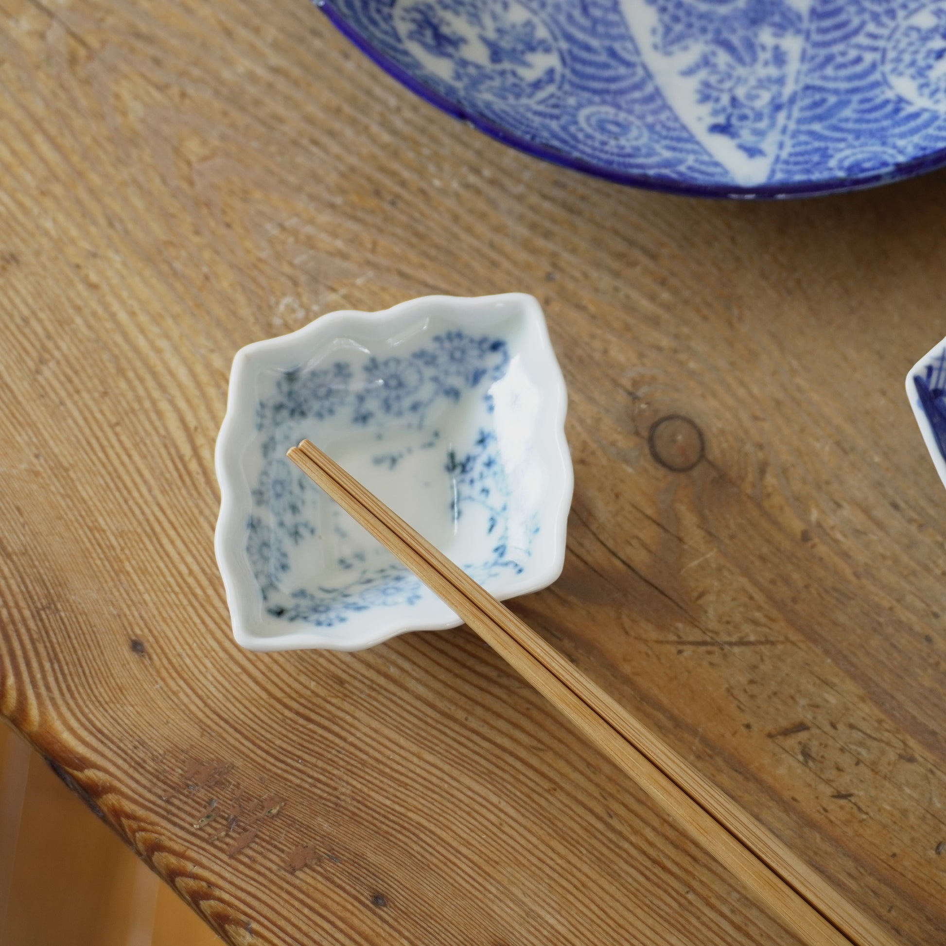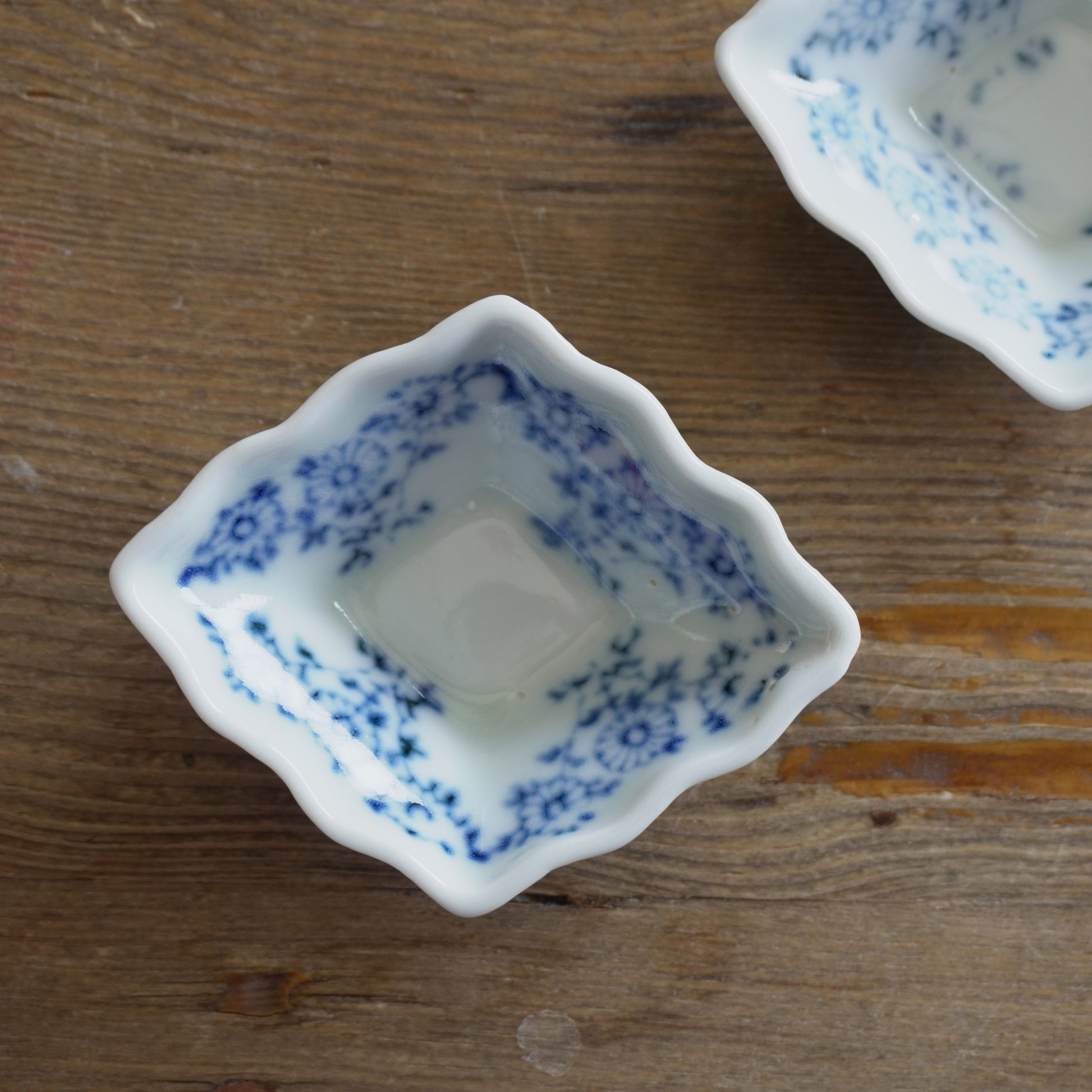 手のひらですっぽりと包み込める、愛らしい菱形の豆皿。 器の縁を飾るのは、淡い藍色で表現された繊細な花々の連なり。