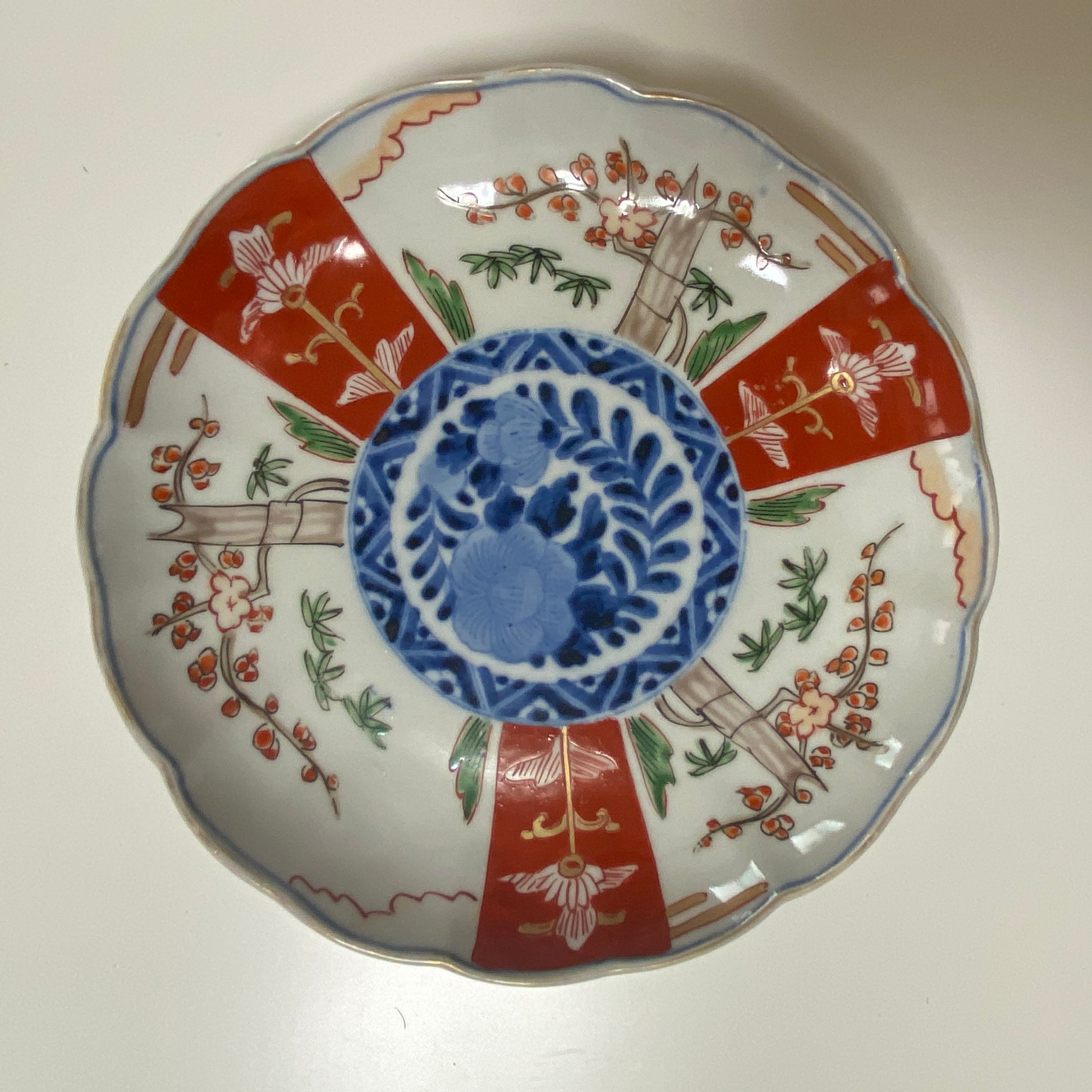 放射状の構図と輪花の縁が、華やかさの中にやわらかさを添えています。