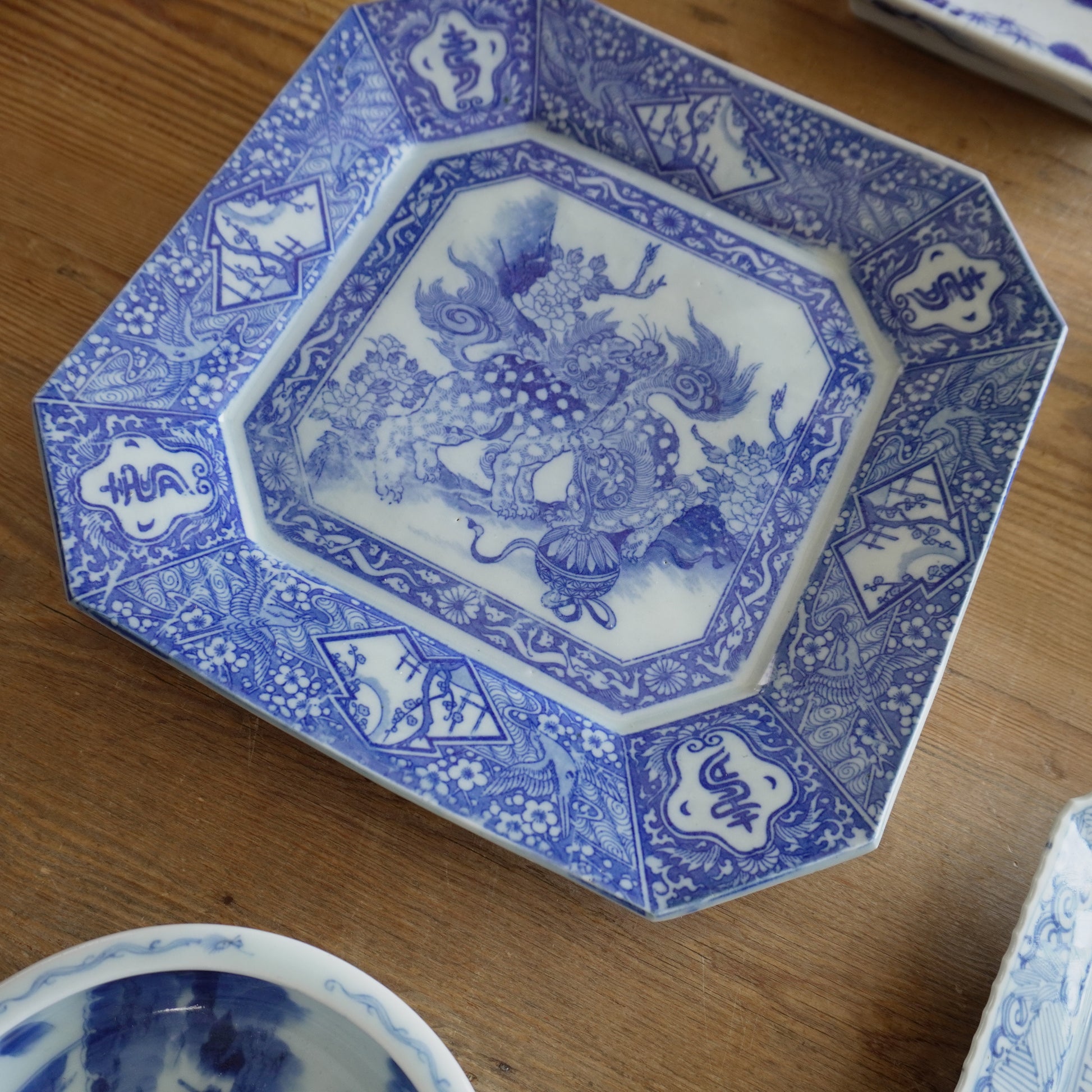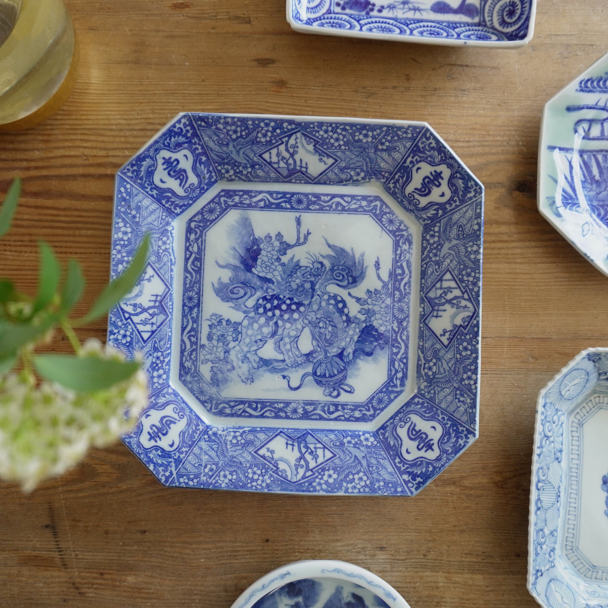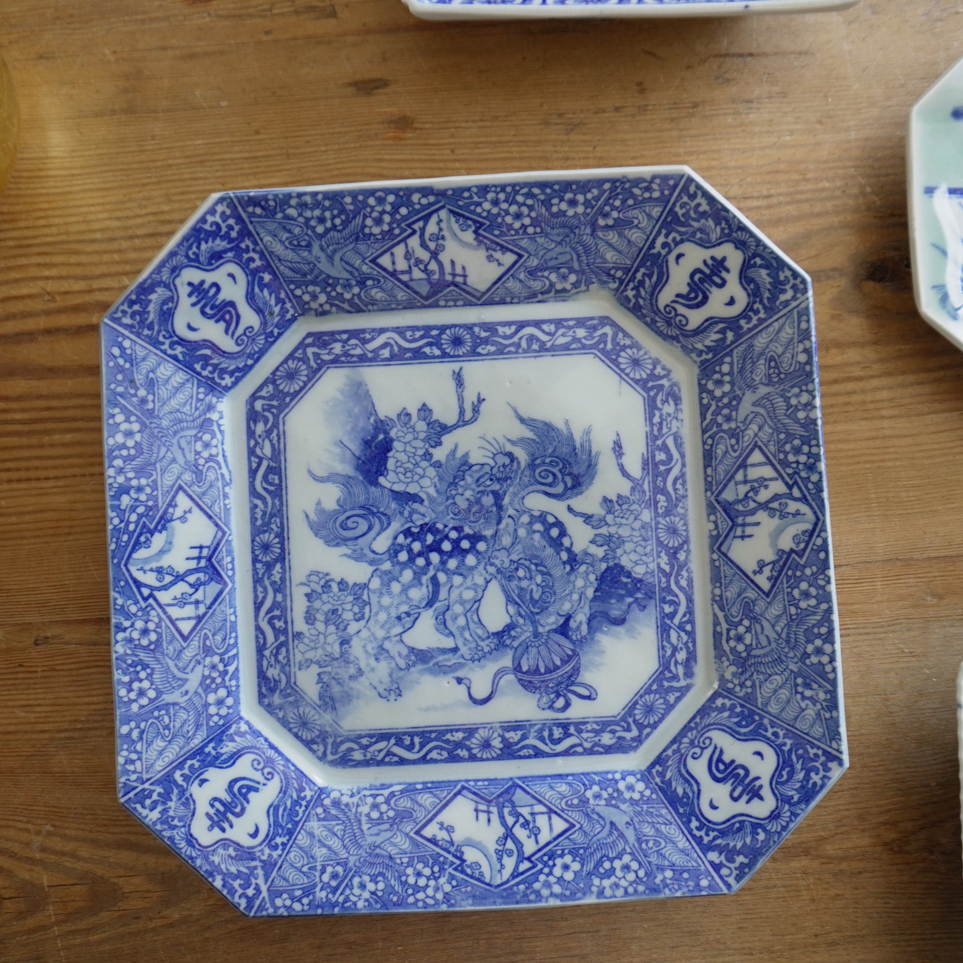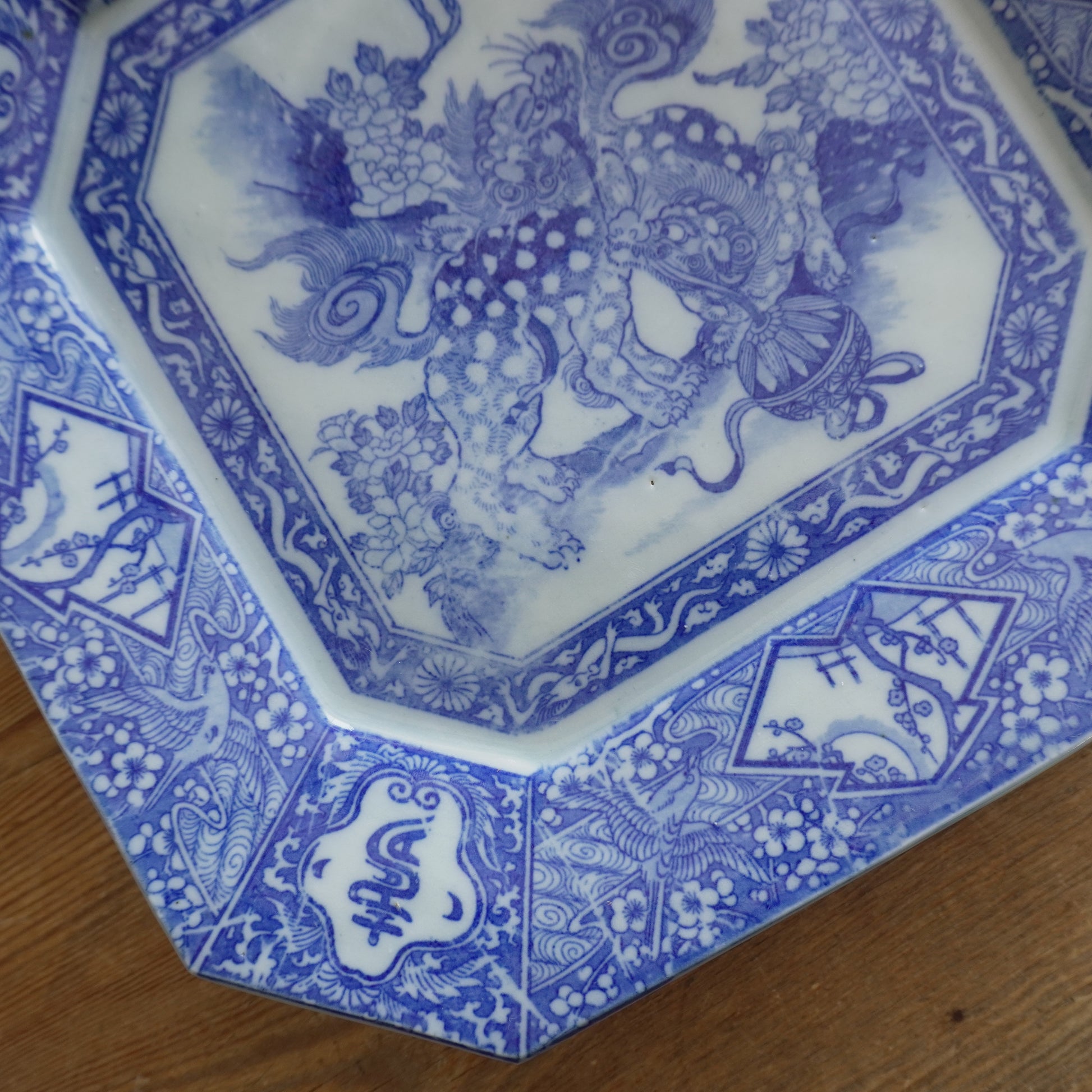 獅子と牡丹咲く角大皿