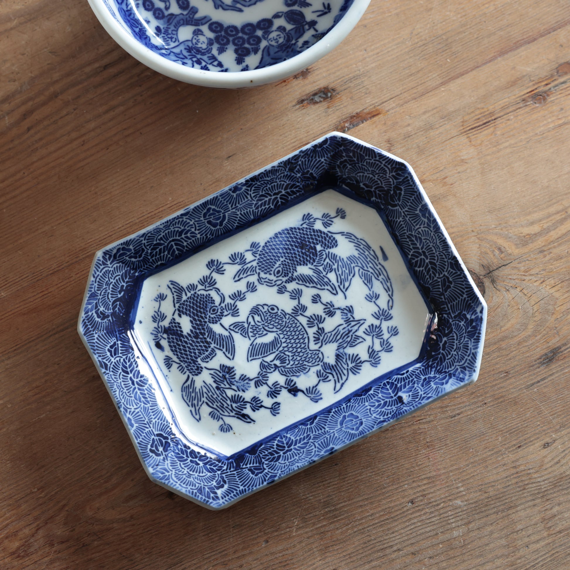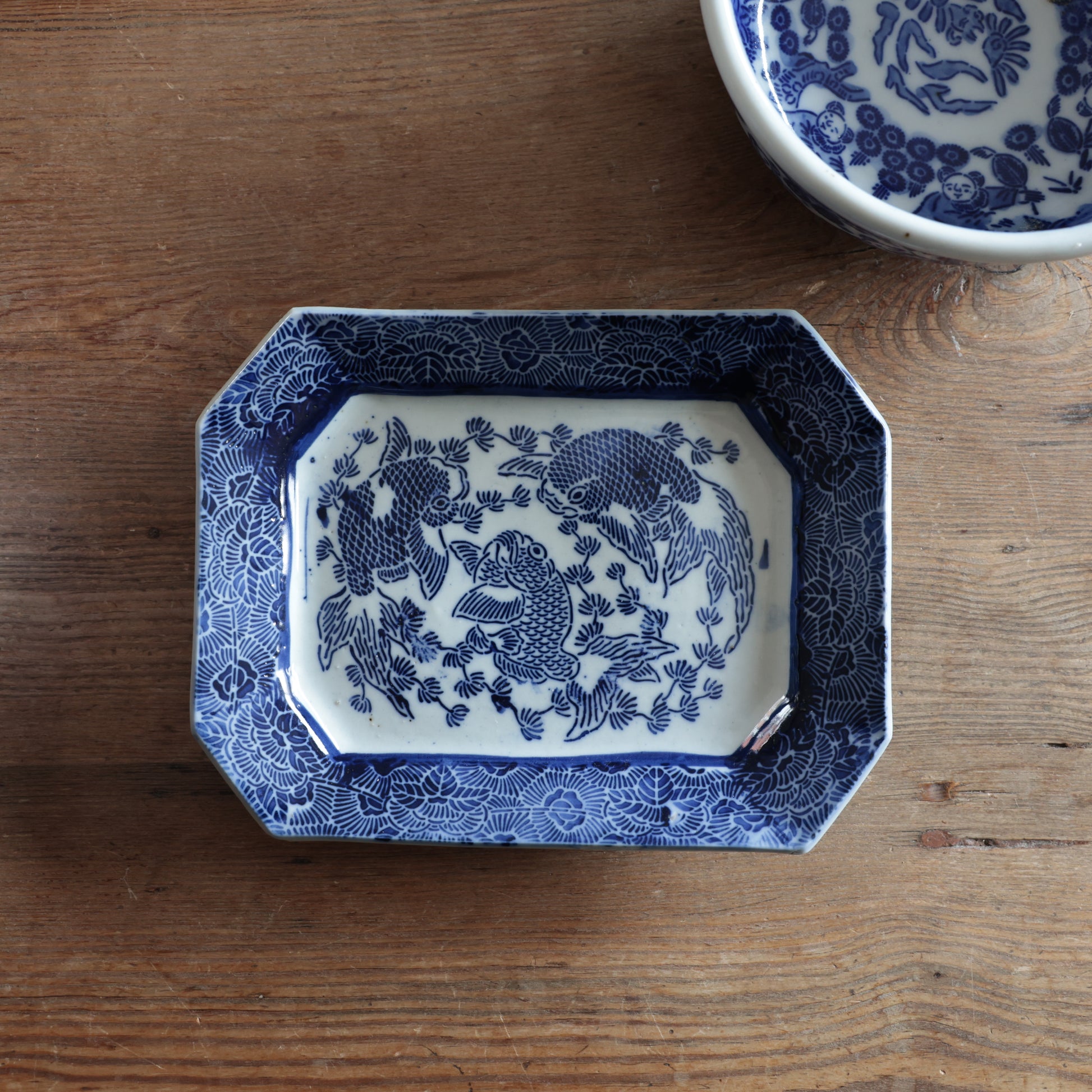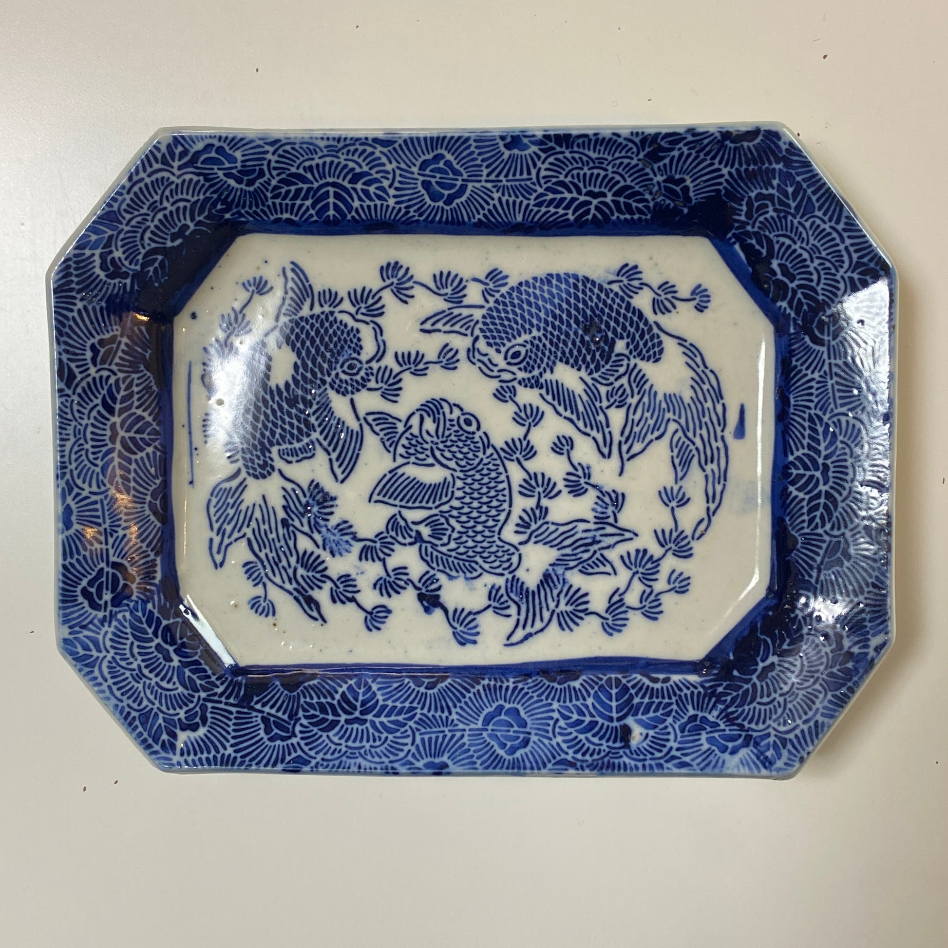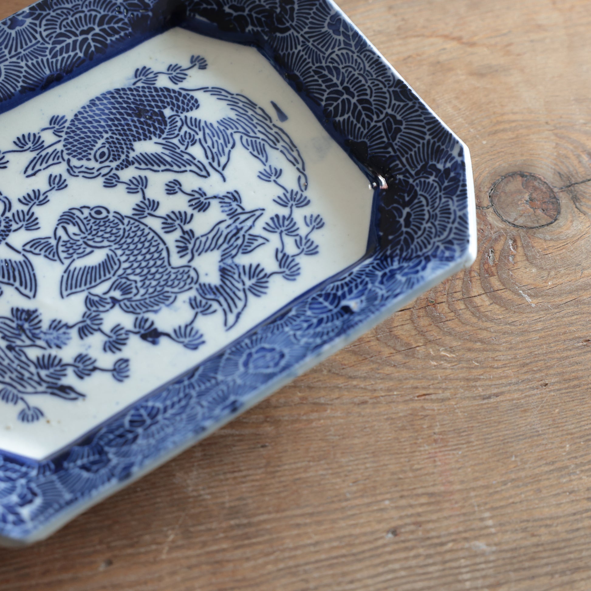 周囲を埋め尽くす微細な青海波や松の意匠が、鯉のダイナミックな動きを際立たせます。使い勝手の良いサイズの角皿です。
