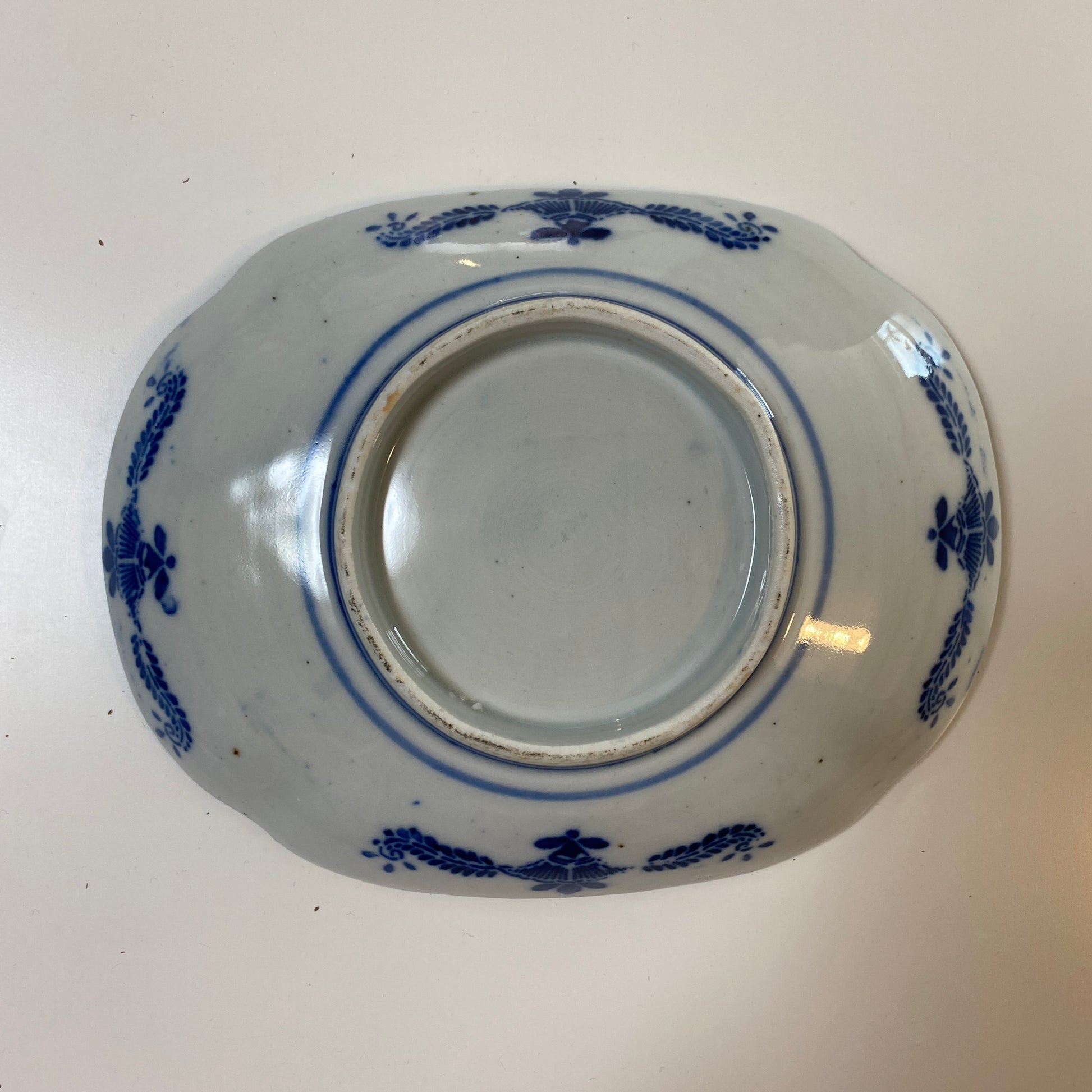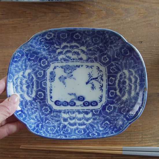 中央の控えめな風景画とのコントラストが、骨董ならではの奥深さを感じさせます。 小ぶりな楕円皿は、取り皿としてはもちろん、小さなおかずをちょこんと載せるのに最適。いつもの食卓に、そっと小さな華を添えてくれる名脇役です。