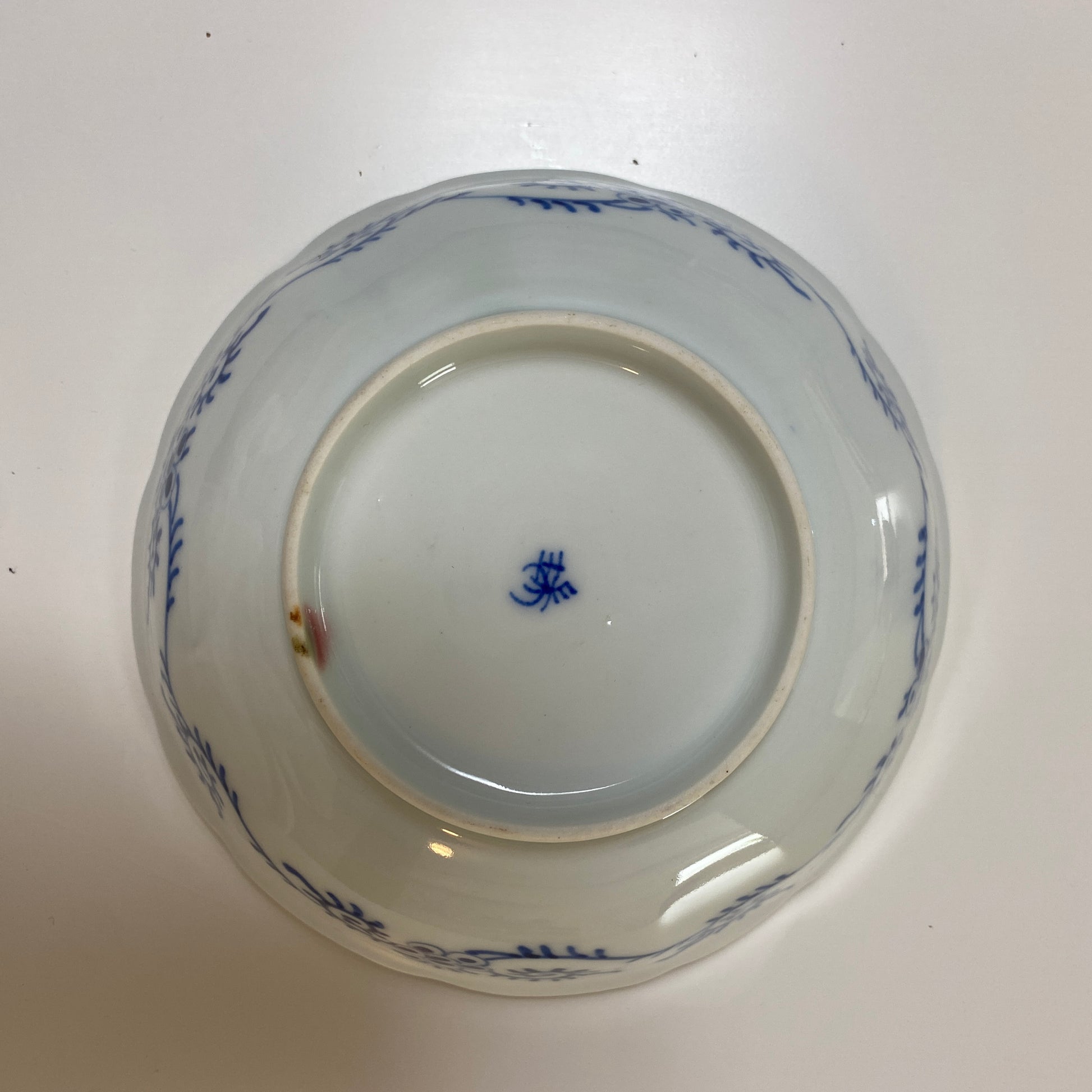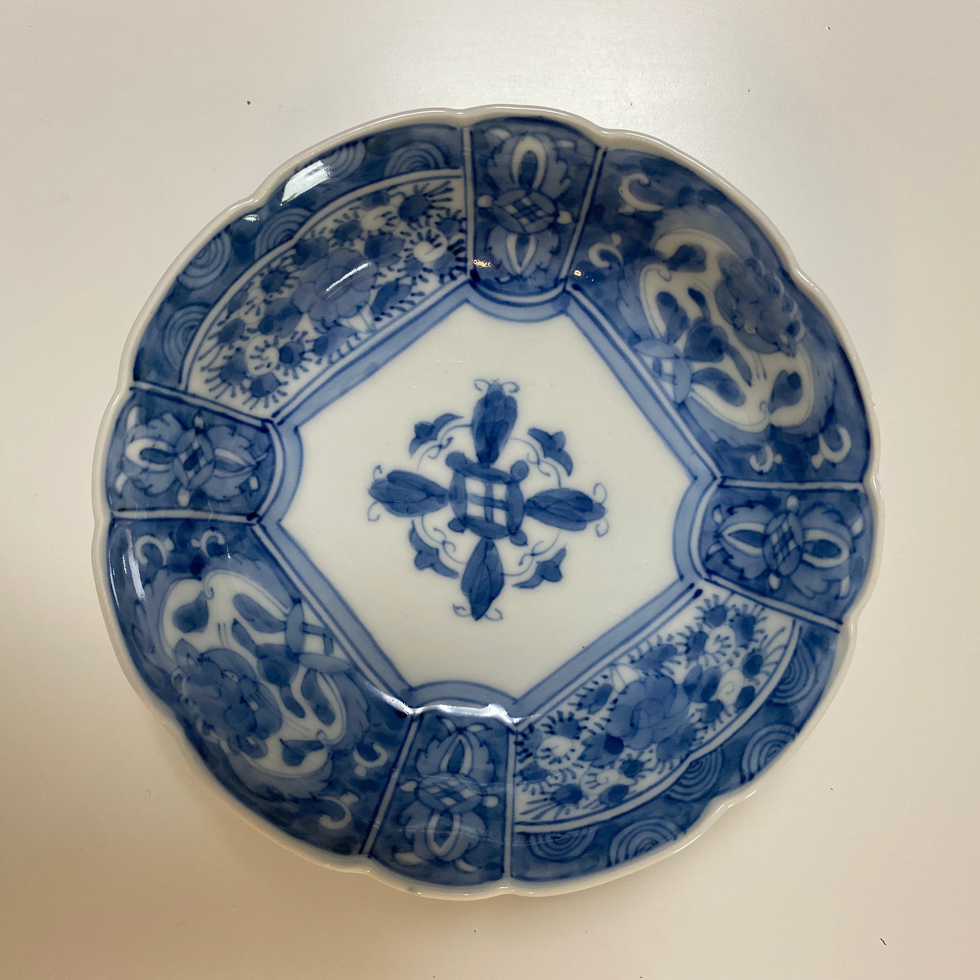 やわらかな輪花の縁に、藍の文様が美しく広がる染付の鉢です。